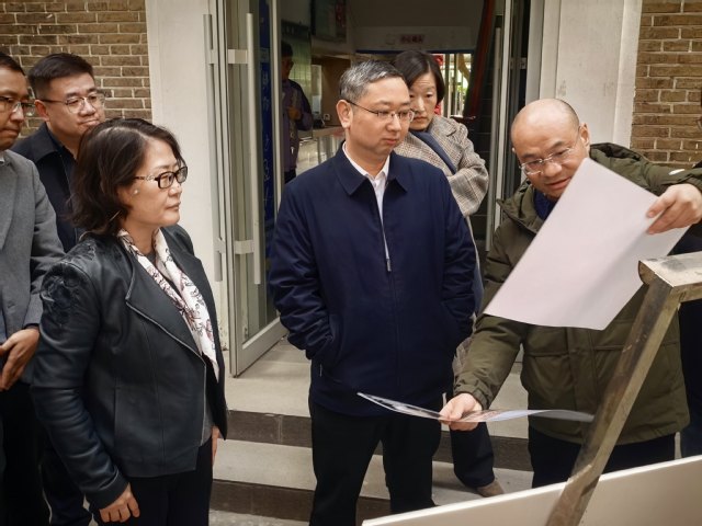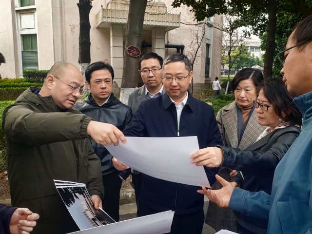12月5日,校党委书记宋来实地调研我校杨浦校区英华楼修缮工程进展,并实地听取了三好堂修缮工程项目、4号5号学生公寓拆改建工程项目设计方案。校党委副书记仰颐、校党委办公室主任黄俊、后勤保障处处长王云欢、基建处处长韦应祺陪同调研。