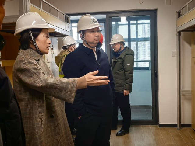 宋来一行首先来到英华楼修缮工程项目现场,了解项目施工工程进度、工程质量与安全管理情况,仔细查看样板间家具布置、各功能用房区域规划,他指出,英华楼修缮工程是未来学生生活的重要场所,修缮工作要在确保结构安全、施工规范的前提下,着力提升住宿品质、优化功能布局并完善配套设施,切实改善学生的居住条件与生活环境。